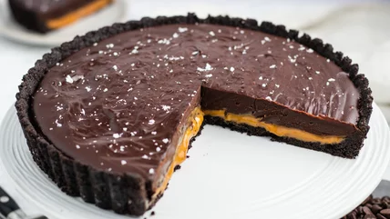 Put the tart back in the fridge for at least two hours to set. Once your timer goes off, sprinkle the top of the tart with flaky sea salt. Then, remove the tart from the tin and serve. This is great on its own but Brookes also provided a few great suggestions. "With fresh raspberries or strawberries would be lovely. Or you could go all out and have with ice cream," she shares. If you have some tart left, don't worry. "Leftovers should keep up to 4 days in the fridge," Brookes shares. We hope this one hits the spot!