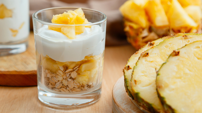 Another way to keep the bromelain from bothering your tongue is to consume fresh pineapple with a creamy dairy like yogurt, crème fraîche, or ice cream. These items have milk proteins that interact with this rather aggressive enzyme, neutralizing it in the process. This is one reason why fresh pineapple smoothies made with yogurt or ice cream don't have the same acidic mouthfeel as fresh pineapple juice. When mixed with creamy dairy, fresh pineapple can even be enjoyed as part of a fruity parfait.