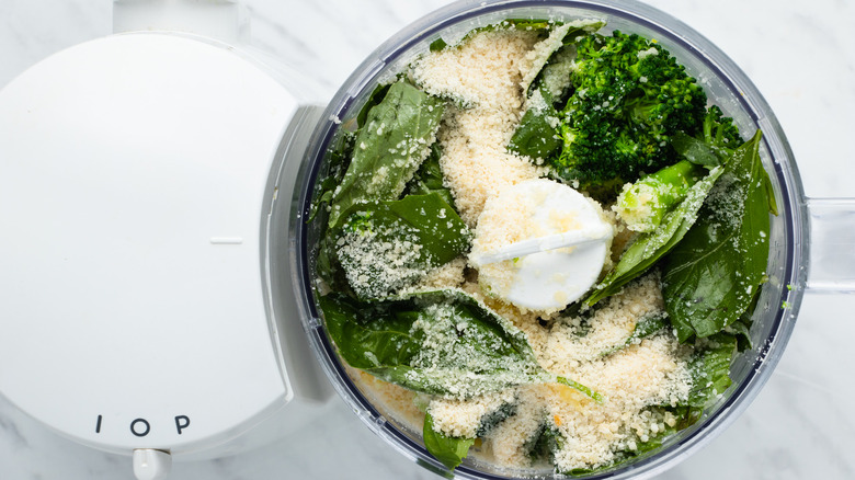 Now, grab a food processor and toss in the broccoli. At this time, you can also throw in the remainder of the ingredients, including the basil leaves, olive oil, lemon juice, garlic, Parmesan cheese, salt, and pepper. This melody of ingredients goes so well together. "A food processor will be much more powerful and blend everything much smoother but you could try in a high quality blender," Brookes shares. Blitz the ingredients until smooth. This shouldn't take more than 60 seconds or so. Be sure to stop and scrape down the sides of the food processor if necessary.