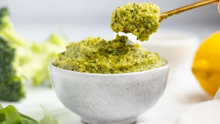Recipe developer Catherine Brookes of Blue Sky Eating is a pro when it comes to whipping up tasty spreads. She came up with this amazing broccoli pesto, and there's no doubt that it's a crowd-pleaser. "I love this tasty and nutritious twist on classic pesto! Broccoli adds a subtle nutty flavour and blends down really easily in the food processor," Brookes raves. "I would use this for a quick weeknight dinner. You can make it in advance so all you need to do is stir it through some cooked pasta and you have a super quick and delicious meal." Keep reading for step-by-step instructions on how to make this lovely spread.