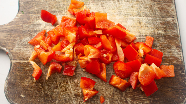 - Get a chopping board and slice the dried apricots into quarters, thinly slice the mint, and chop both the red pepper and red onion into ½-inch pieces.