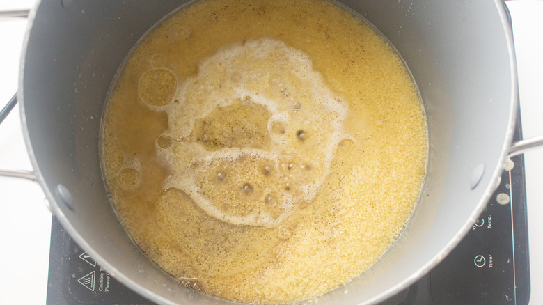 To begin this recipe, you'll want to get the base of the dish — the couscous — cooked. Measure the couscous into a pot, and add in the chicken broth (or vegetable broth), 2 tablespoons of extra virgin oil, salt, and pepper. Put this mixture on the stove top and allow it to come to a boil, then reduce to a simmer. The amount of cook time may vary slightly, but typically you will need to cook the couscous for about 10 to 15 minutes, until it has absorbed the liquid.