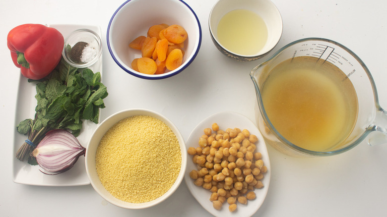 This will be an easy dish to prep. You'll need 1 ½ cups of couscous, 2 cups of chicken broth, 4 tablespoons of extra virgin olive oil (divided twice into 2 tablespoons each), ¼ teaspoon of salt, ¼ teaspoon of black pepper, and ½ cup of dried apricots. Preparing these veggies will be quite simple. Be sure to collect 1 ounce of fresh mint, a red bell pepper, ½ of a red onion, and 1 cup of canned chickpeas. We asked Olayinka if this can be modified for vegans and vegetarians, and the answer is yes. "Minus the chicken broth," she notes. "That can easily be vegetable broth."