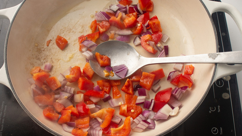 - Get a saucepan and into it place 2 tablespoons of extra virgin olive oil, the chopped bell pepper, and chopped red onions. Sauté for 2 minutes.