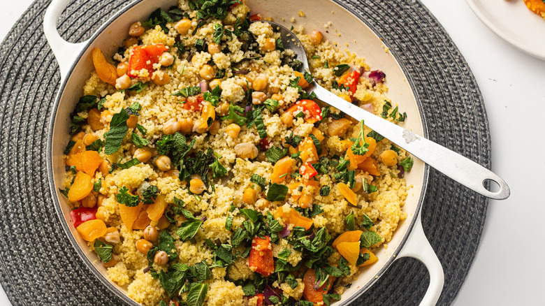 - Add the chickpeas to the saucepan, then the cooked couscous, then stir everything together.