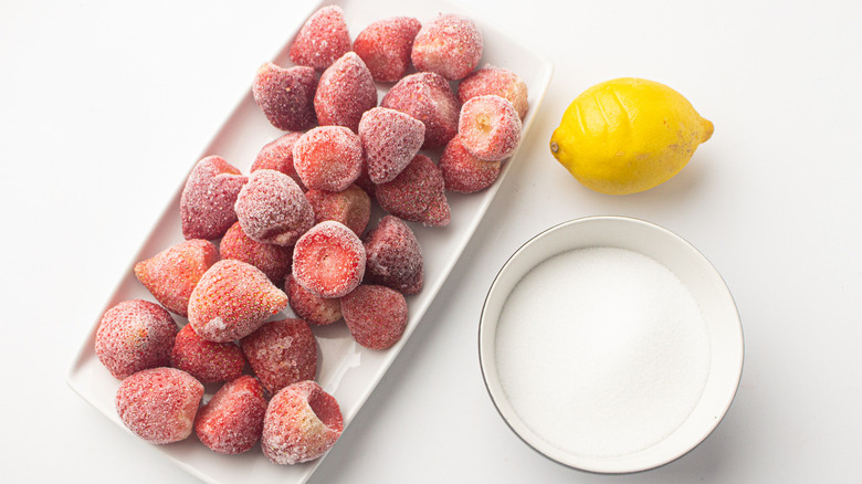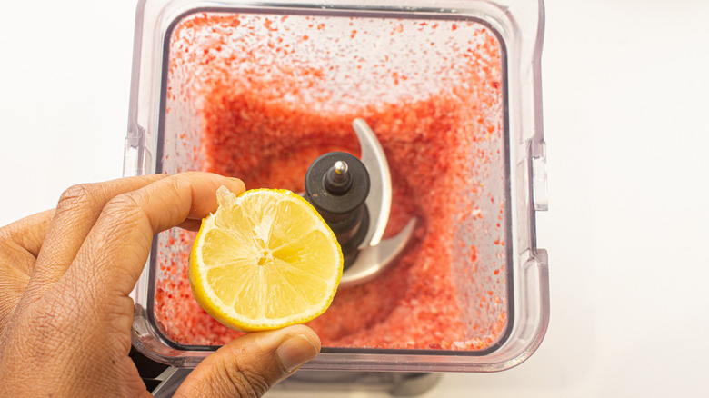 Begin the recipe by placing the frozen strawberries in a blender. Set it to the highest speed and blend the strawberries for 20 seconds. They should churn out to a sandy texture. Next, open the blender and pour in the sugar along with the juice of one lemon. Securely seal the blender's top and blend this mixture for 30 seconds. Scrape down the sides of the blender, then continue repeating the process until the mixture has a uniform texture. You might have to do the blend-and-scrape about 5 times to achieve the right consistency. You'll know it's ready once the sorbet is soft and creamy.