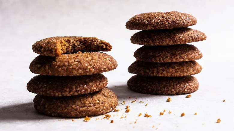 The warm, unmistakable flavors of molasses, cardamom, cloves, cinnamon, and ginger combine in this easy chewy molasses gingersnaps recipe. These cookies come together in less than half an hour and our recipe makes a whopping near-50 cookies, more than enough to feed the entire family and then some. Enjoy these quintessential fall and winter flavors with abandon, as our recipe works out to fewer than 80 calories per cookie.