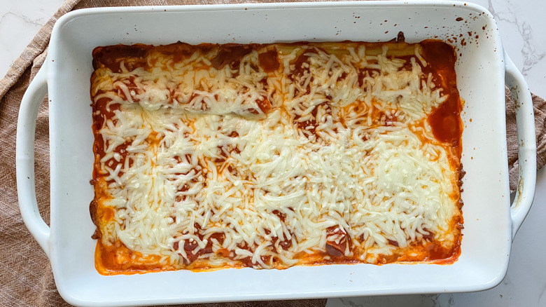 - Sprinkle mozzarella cheese over top of the sauce-covered noodles.