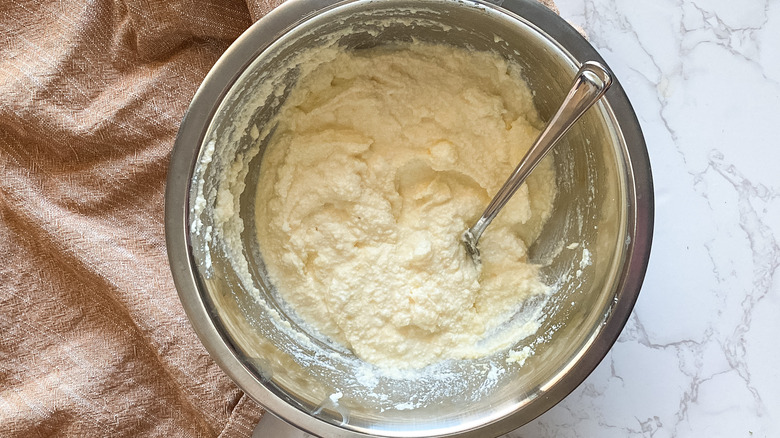 Now, it's time to make the manicotti filling. In a medium-sized bowl, add the ricotta cheese, the egg, and the grated Parmesan cheese. Using a spoon, mix this combination well, making sure to break up the egg. Carli notes that "this combination is a classic ricotta filling, but if you want more texture or flavor you can easily add some frozen and then thawed spinach, sautéed mushrooms, minced garlic, or Italian seasoning to this filling." Of course, nothing beats that classic plain cheese filling!
