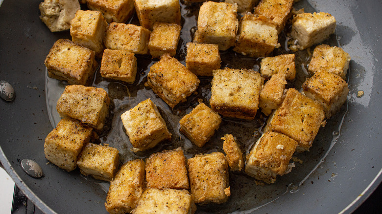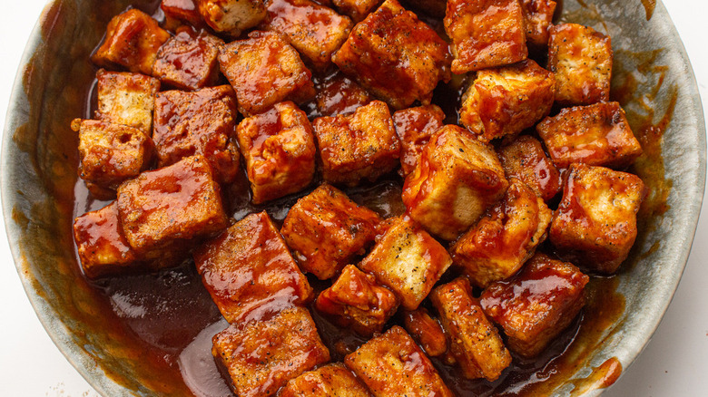Once your tofu is done frying, there's just one last step: Toss it in barbecue sauce. After all, it wouldn't be BBQ tofu without the sauce, right? So, simply place the cooked tofu in a bowl or on a plate, pour the barbecue sauce over the top, and mix it all together. Just like that, you're ready to serve and enjoy this delicious BBQ tofu! As for pairing options, Olayinka suggests a variety of potatoes, including mashed or sweet, or "any grain." Whichever way you choose to serve up this dish, you'll relish in the warm and comforting flavors of the barbecue sauce, along with the delicious crispiness of fried tofu.