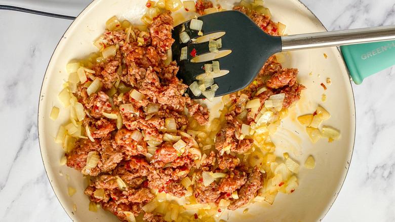 - Heat the olive oil in a large skillet over medium heat. Add the onion and cook until translucent, about 5 minutes. Add the minced garlic and continue cooking for another minute, until fragrant. Add the Italian sausage and cook until browned. Remove any excess fat and set the mixture aside to cool, about 10 minutes.