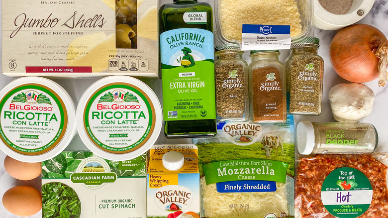 To make MacLean's recipe for sausage and spinach stuffed shells, you'll need the ingredients for the filling and the sauce, as well as the jumbo shell pasta required for assembly. For the filling, you'll need 1 pound of mild or hot Italian sausage (with the casing removed), 1 tablespoon olive oil, 1 medium yellow onion, and 4 cloves of garlic, along with 6 ounces shredded mozzarella cheese, ½ cup grated parmesan cheese, 2 eggs, 2 teaspoons Italian seasoning mix, plus ½ teaspoon dried basil, 1 teaspoon salt, ½ teaspoon black pepper, and 1, 10-ounce box frozen, chopped spinach. Although, you'll want the spinach fully thawed and drained, which you can accomplish by squeezing it between paper towels over the kitchen sink.
