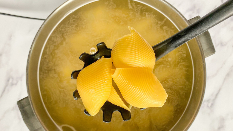 The first step is cooking the pasta so the shells will be cool enough to handle by the time you're done with the rest of the prep work. As noted above, you'll want to parboil the shells, which is to say, cooking them just enough to make it possible to fill them. The rest of the cooking happens in the oven.