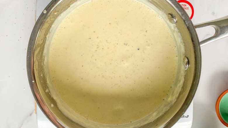 - Add the cream and smashed garlic to a small saucepan and heat over medium-low until simmering, stirring occasionally. Once simmering, add the nutmeg and a pinch of salt and pepper. Reduce to low heat and simmer for 8-10 minutes, stirring frequently, until the mixture coats the back of a spoon. Whisk in the remaining ½ cup of Parmesan cheese and cook for 2 more minutes. Remove from the heat.