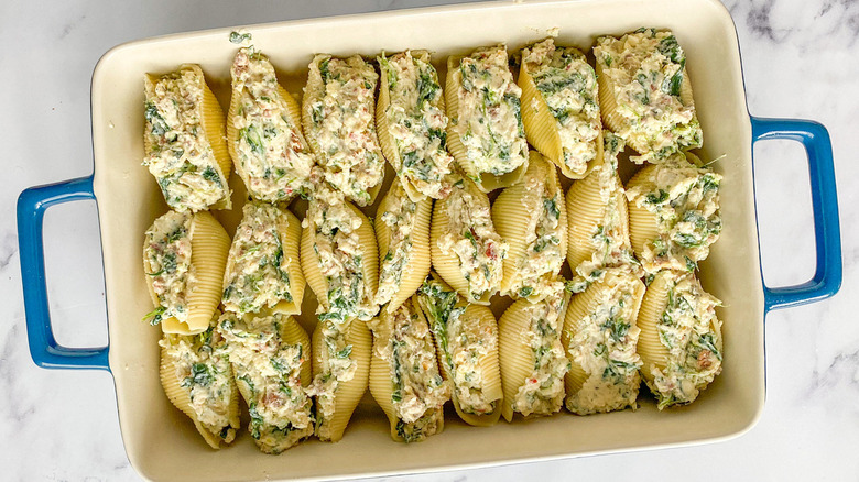 "These stuffed shells are so creamy and delicious!" MacLean tells Tasting Table, adding that they're simple to make, too. "The most important thing to remember is not to over-boil your shells," she says. If you're used to cooking your pasta to al dente, or until it's nice and soft, you'll want to hold back for this recipe. The shells are meant to be parboiled — just barely softened before they're removed from the hot water. This makes them easy to stuff and prevents over-cooking when they're baked at the end of the recipe.