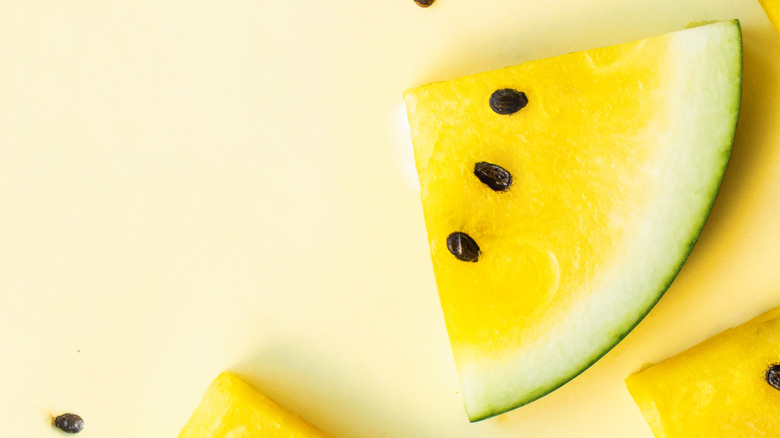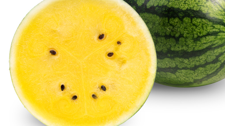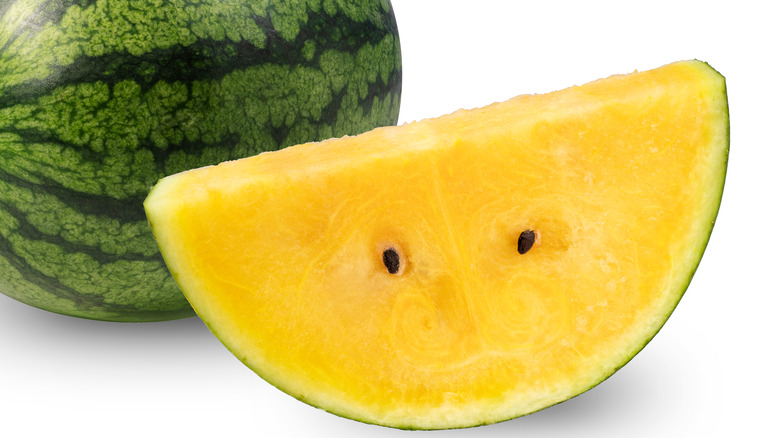 Yellow watermelons might be considered "exotic" here, but they are far from that on the African continent. There, yellow watermelons thrive under challenging conditions for a plant; That is, dry and hot weather. Their ability to hold water makes them especially precious in a land where water is scarce, so it should come as no surprise that yellow watermelons are also known as "desert kings." They even play a supporting role in wall paintings found in King Tutankhamun's tomb, and some experts believe the fruit might have been left in burial areas so kings would have a hydration source as they moved from this world into the next. Yellow watermelons were also found along trade routes — their seeds were sold, while the flesh was used to keep traveling explorers from becoming dehydrated (via Specialty Produce).