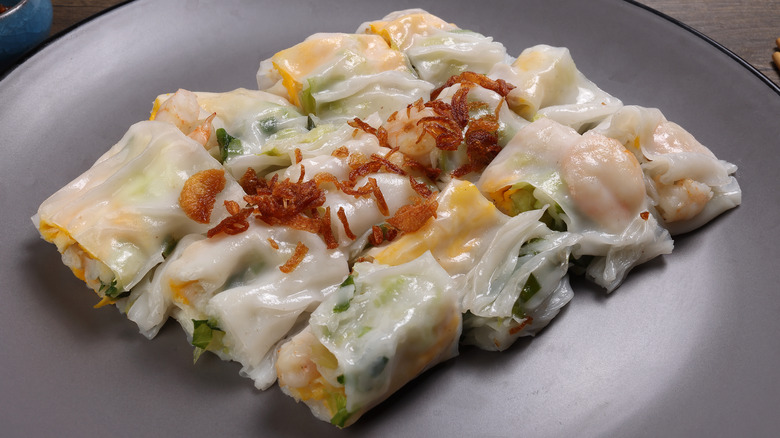 Cheong fun is often referred to as pig intestine rolls in China but it has nothing to do with the animal's intestine. Cheong translates to intestine and the dish is called so because of its appearance. Cheong fun is a simple Chinese noodle made from rice flour but the noodle is so silky, translucent, and tender that it is thought to resemble the intestines of a pig.
