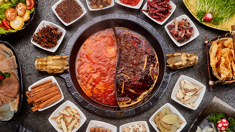 A typical broth is made of chicken, ginger, and aromatics but its Sichuan version can be much spicier with the addition of the region's signature peppercorns and red chilies. Dipping ingredients on the side include all sorts of small foods, such as sliced meats, meatballs and fish balls, noodles and rice cakes, as well as veggies. These ingredients are then accompanied by an equally vast array of sauces.