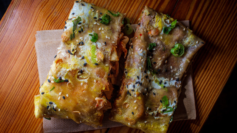 Today, street vendors in China — and eateries like the Jianbing Company in Brooklyn — layer a beaten egg onto the crepe, sprinkle in a mix of cilantro and green onions, layer fermented vegetables, bean curd, and chili, and cover the fillings in hoisin sauce. Often, a crisp cracker called baocui is added for crunch. Jianbing is then wrapped, rolled, sliced, and served just as morning hunger pangs begin to take over.