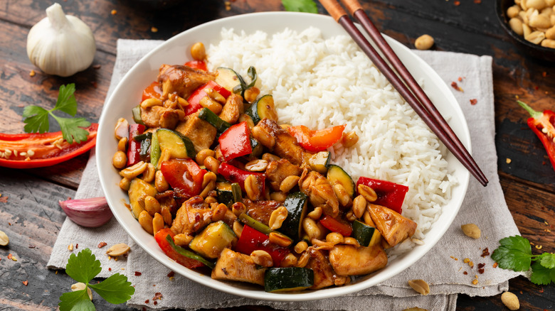 Kung pao chicken is a stir-fry dish made with chicken, chilies, peppercorns, garlic, ginger, onions, and roasted peanuts that's been tossed in a sweet, sour, and salty sauce. It often gets compared to similar dishes like sesame chicken and General Tso's chicken.
