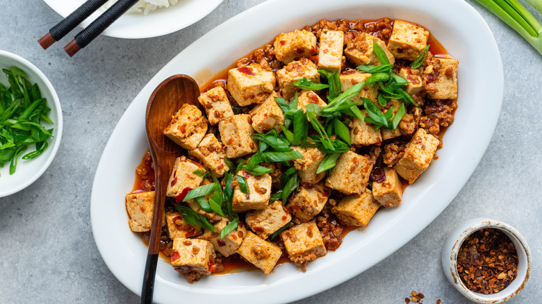 To be clear, many traditional recipes for mapo tofu do call for ground beef or pork. So, this isn't a vegetarian dish, per se, but it can be. Our recipe for vegetarian mapo tofu skips the meat and can be made with ingredients from your local supermarket. If you're looking for something a bit more traditional, add some Sichuan peppercorns and dried chilies. Then, buckle up for a delicious and pleasantly punishing meal.