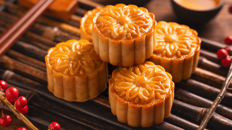 If you've ever taken part in the Chinese Mid-Autumn Festival, you will have noticed tiny cake-like treats with beautiful decorations and inscriptions on top. These little cakes have a rich history sprinkled with colorful legends and hold great significance for the autumn celebrations. The round cakes have a pastry skin with a paste of jujubes, lotus, or sweet red beans for filling. The filling can also have fruits, nuts, seeds, salted egg yolks, and occasionally, the savory ingredient like ham.