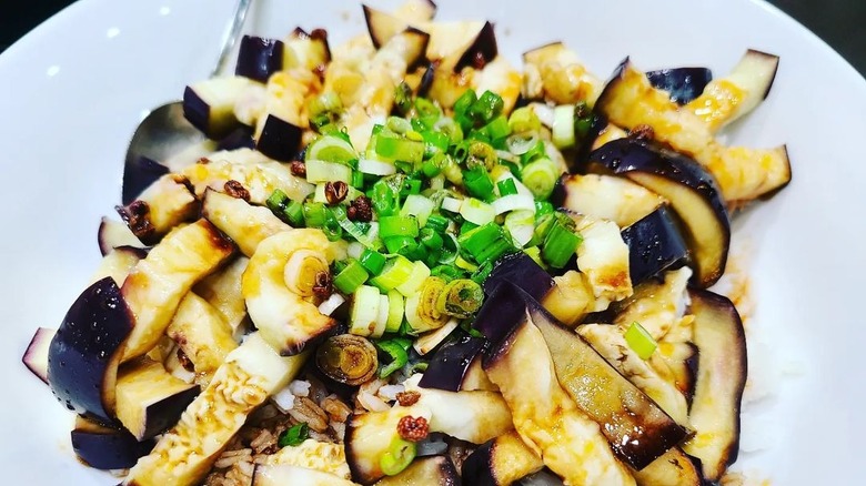 One of the best uses for Chinese eggplants is in a dish called liang ban qie zi — or seasoned steamed eggplant. Steaming Chinese eggplants unlocks all kinds of good things, including a subtle earthy flavor and that silky texture. After the eggplants are cooked, they are topped with garlic, ginger, and scallions. Then, the hot oil is poured over both the eggplant and the aromatics, and finished by drizzling a mixture of soy sauce, black vinegar, and sugar.