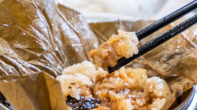 Sticky rice is used to make one particular Chinese dish that you should try at least once — lo mai gai, or sticky rice with chicken. To make this dish, sticky rice, chicken, mushrooms, Chinese sausage, and other filings are wrapped inside lotus leaves to form little packages. These packages are then steamed, which both cooks the filling and infuses it with the subtle flavor of lotus leaves. The wrapped packages are then served, opened, and enjoyed as you would a similarly wrapped dish like tamales. In addition to being an essential Chinese dish, sticky rice with chicken is also a must-order dish during a dim sum feast.