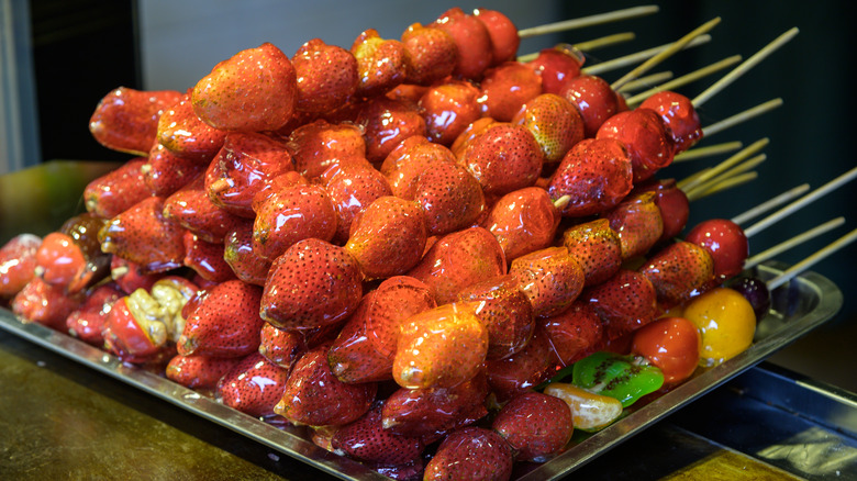 While hawthorns are still the preferred fruits to make tanghulu, strawberries, apples, and grapes are equally good alternatives to try and make tanghulu at home. Make a simple sugar syrup and dip your skewered fruit stick in it while it's still hot. The snack is best eaten as soon as it cools down so that the sugar doesn't become rock hard. Additionally, tanghulu is more popular in the months of winter when the summer heat isn't melting the sugar coating and turning the candied fruits into a sticky mess.