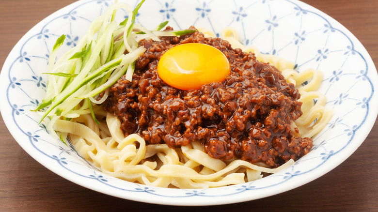 Zhajiangmian sometimes has a third ingredient — fried diced pork. Additionally, raw or blanched vegetables like cabbage, edamame, and bean sprouts are added on top for crunch. In northern China, chewy zhajiangmian noodles are often handmade and sliced into strips of fairly thick and long noodles.
