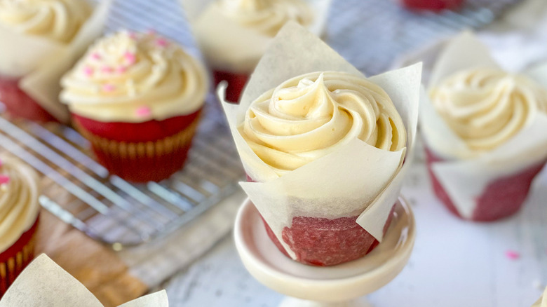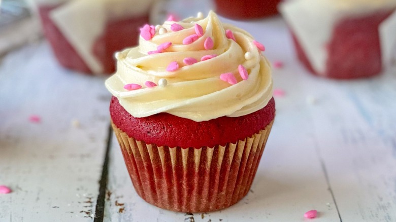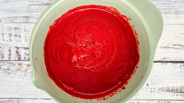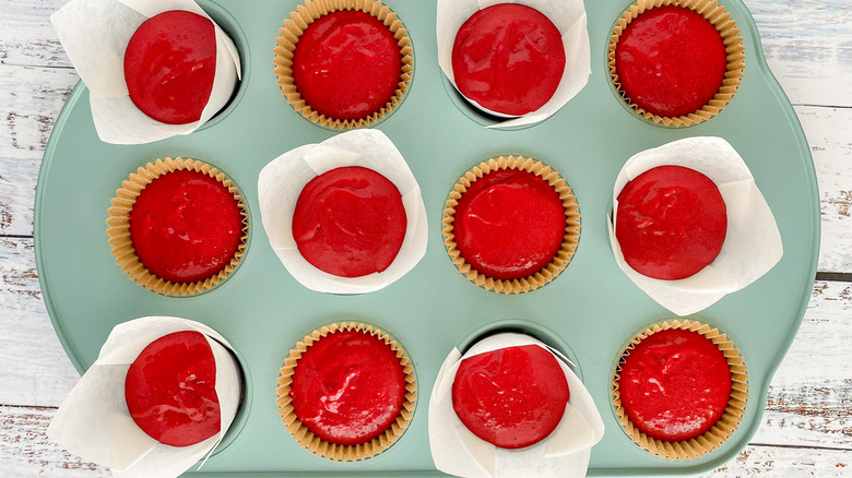 When you make red velvet cake from a box, you don't need to come to terms with just how much food coloring is needed to turn a chocolate cake red. If you make your cake from scratch, as recipe developer Hayley MacLean does here, you'll see just how much is needed — up to 2 whole tablespoons in all. MacLean does say, though, "You can choose to use less food coloring if you like," but admits "I just love making these cupcakes bright, bold, and full of color." If you like, though, you can dial the amount back to just a tablespoon, or even less, if you don't mind a less-vivid cake.