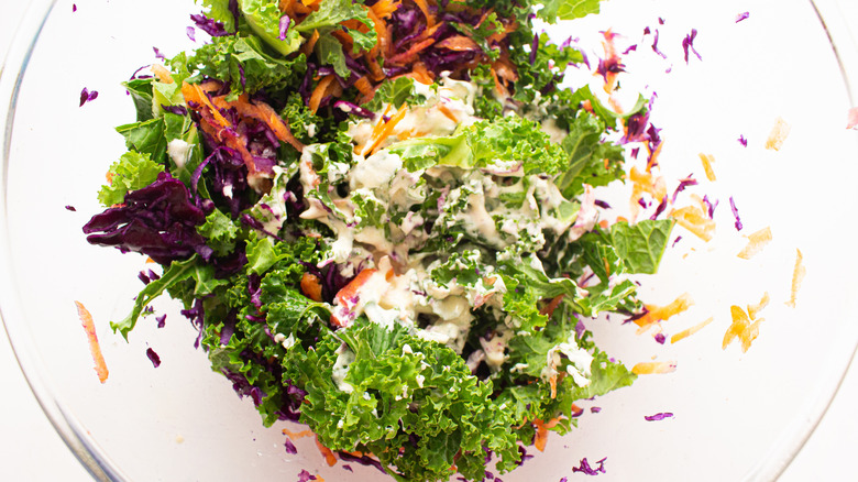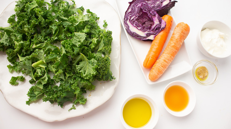 To prepare four solid servings of this tasty, crunchy slaw, you'll need two cups of chopped kale, a half cup's worth of purple cabbage, two medium-sized carrots, a teaspoon of whole-grain mustard, 2 tablespoons of extra-virgin olive oil, 2 tablespoons of apple cider vinegar, and ¼ cup of Greek yogurt. In other words, you won't really need much at all! It's a perfect combination of three crisp, tasty veggies and a rich, tart dressing that you'll want to enjoy again and again.