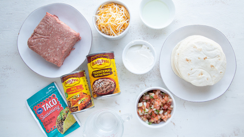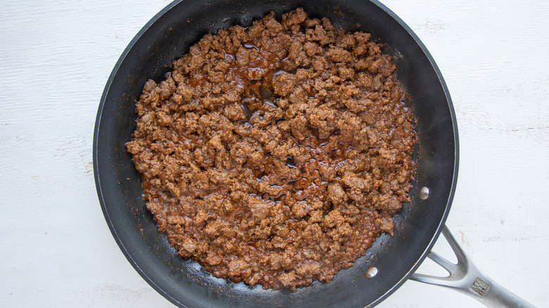 Shungu's recipe for Mexican pizza calls for a pound of ground beef, but you can, of course, substitute any other ground meat, poultry, or meatless meat, because the Mexican seasonings are the real highlight here. Those seasonings will come primarily from a packet of taco seasoning mix, which you can purchase in the spice aisle of your supermarket, if you don't feel like making your own. When you fry up the meat, it will be with the taco seasoning and a half-cup of water.