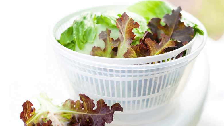 As The Spruce Eats explains, the best way to store lettuce is to give it both air circulation and moisture, best achieved by washing lettuce, spinning it completely dry, then removing the basket from the salad spinner and adding an important touch: some damp, but not wet paper towels on top of the basket. You can pop the basket into the fridge just like that, making sure to re-dampen the paper towels periodically.