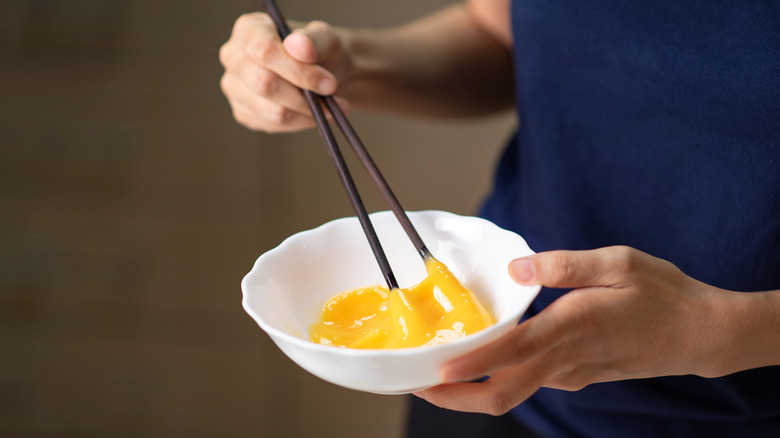 Instead of reaching for a whisk or even a fork to beat your scrambled eggs, try using chopsticks. If you've ever seen the Japanese omelets that went viral on TikTok, you may have noticed that they always use chopsticks before and while cooking the eggs. You'd think that using two wooden sticks won't be nearly as effective as a four-pronged fork, but as you'll see in the TikToks, this technique results in a silky yet fluffy texture every time.