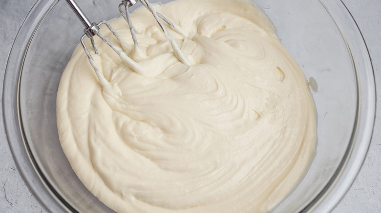 Now that you have your ingredients ready to go, you can begin making this recipe. As Morone stated, the bottom layer of this dessert is cake-like, so we'll start by prepping the dough. First things first, however, you'll want to preheat your oven to 350 F, and either line a 9x13-inch baking dish with parchment paper or spray it with nonstick spray.