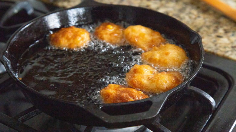 Place the skillet on your stove and crank up the heat to medium. Pour in all the vegetable oil — start with 2 cups, but be prepared to add extra, if needed. It may seem like a lot, but this is just the right amount to fry these corn fritters. "The batter for these is fairly liquid, so these would not work in an air fryer," Shungu says. "You could pan fry them in a smaller amount of oil instead of deep frying."