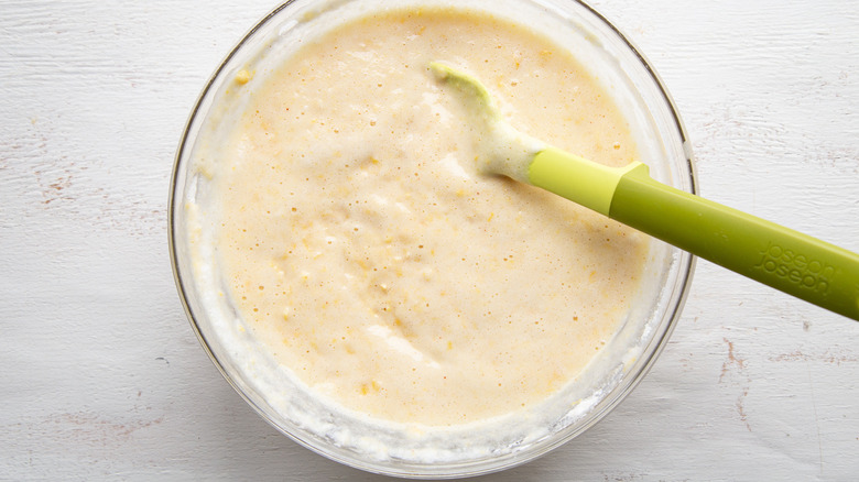 Using a whisk, combine all of the ingredients together. Once you mix the first set of ingredients, go ahead and fold in the egg whites with a spatula. That makes up the batter. Wasn't it simple to make? That's it for the prep work — it's all smooth-sailing from here!