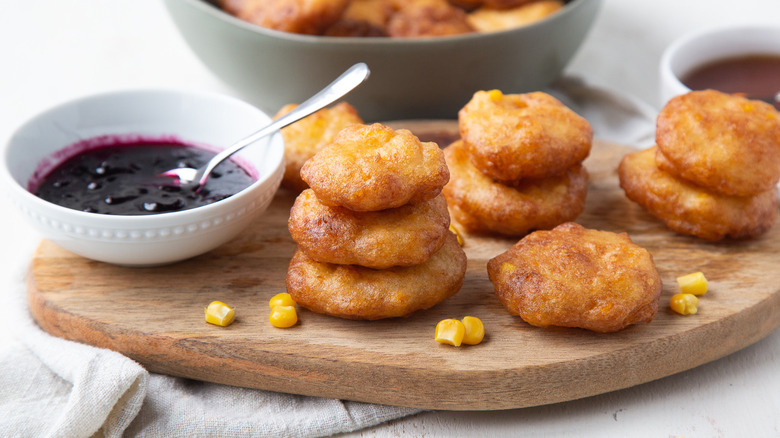 When you take the fritters out of the skillet, place them on a paper towel-lined plate. The paper towels will help absorb the excess oil. Let the fritters cool a little bit before you serve them. "I love serving these with a dollop of blueberry jam — the sweet/tart jam really complements the fritters," Shungu notes. "These are best enjoyed straight out of the fryer. If you have any leftovers, store them in the refrigerator and reheat in the oven on a sheet pan."