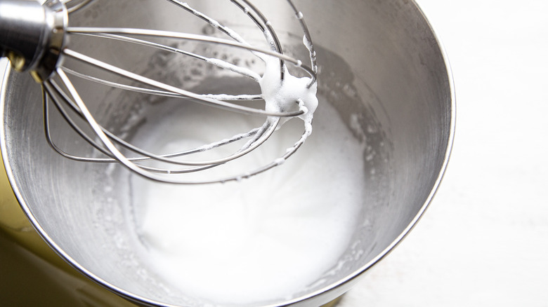 While you wait for your oil to heat up, you can move on to other parts of the recipe. Grab the bowl from your stand mixer and toss in the egg whites. Remember that you'll also need the yolks later so put them in a bowl and set them aside. Turn on the mixer and set the speed to high. Continue mixing until soft peaks form. "The egg whites should resemble soft peaks, meaning the peaks will flop over when you lift the beater out of the mixing bowl," Shungu says.
