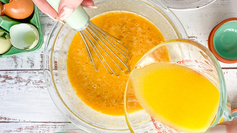 As promised, this pie filling is full of citrusy delight, so get ready to make the most out of your lemons. Grab a large bowl and add the eggs, milk, sugar, lemon juice, lemon zest, cornmeal, flour, and salt. Whisk all of these ingredients together until they're thoroughly combined. Then, slowly whisk in the butter, and place the filling to the side. Keep in mind that the butter should be melted but cooled by the time you add it to the filling.