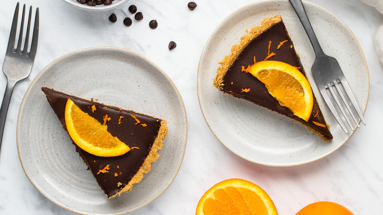 While chocolate and citrus might seem like a peculiar combo, chocolate actually works quite well in conjunction with oranges. Limes and lemons, not so much, but oranges are sweet enough to make for an enjoyable flavor pairing. As recipe developer Catherine Brookes describes this chocolate orange tart, it has a "rich, sweet chocolate ganache [that] tastes so delicious with that buttery biscuit base."