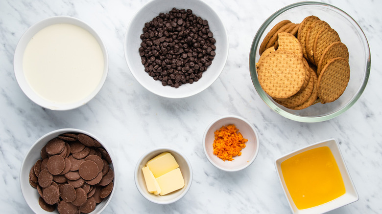 In order to make the crumb crust, Brookes, who is British, uses a type of cookie known in the U.K. as digestive biscuits. These aren't too popular in the U.S. (the cookies aren't bad, but the name could use some tweaking for the American market), but she suggests graham crackers as a readily-available substitute. You'll also need butter, and, for the filling, two types of chocolate: regular semisweet chocolate chips and orange-flavored chocolate. The filling also includes heavy cream and a bit of orange zest.