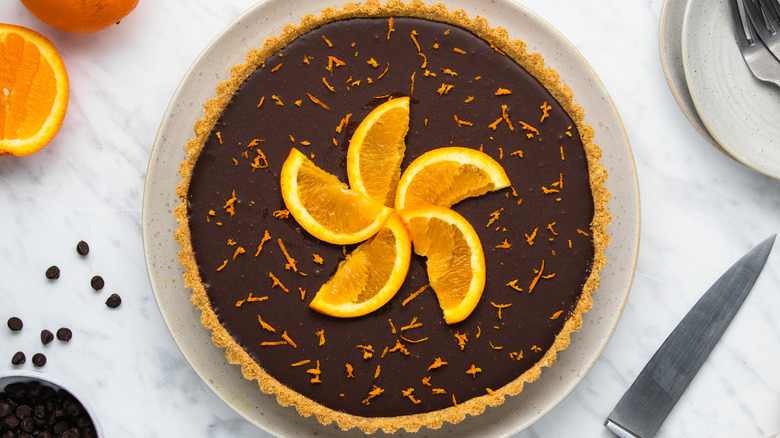 Brookes calls the tart "a decadent-looking dessert to serve for a special occasion." She does say, though, that it's really not at all difficult to make. In fact, most of the time that this recipe takes is simply chilling time, so you can kick back and relax while your fridge does most of the work. Whether you're looking to experiment with a new flavor combination or want to switch up your go-to dessert recipe, this chocolate orange tart has you covered. Keep reading to learn how to make this chocolatey, sweet, citrusy treat!
