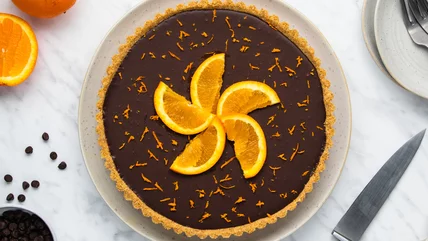 This chocolate orange tart combines rich, chocolatey flavor with delicious citrus, all on top of a buttery crust.