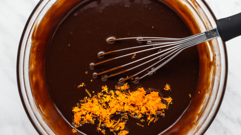 If you are wondering why orange-flavored chocolate is used here rather than more of the fresh orange you'll be using for the zest, Brookes explains that orange juice wouldn't work too well in the ganache. Using flavored chocolate, she says, "allows you to maintain the set ganache texture with just as much orange flavor." If you can't find orange-flavored chocolate, you could always use more chocolate chips and stir in a teaspoon of orange extract instead.