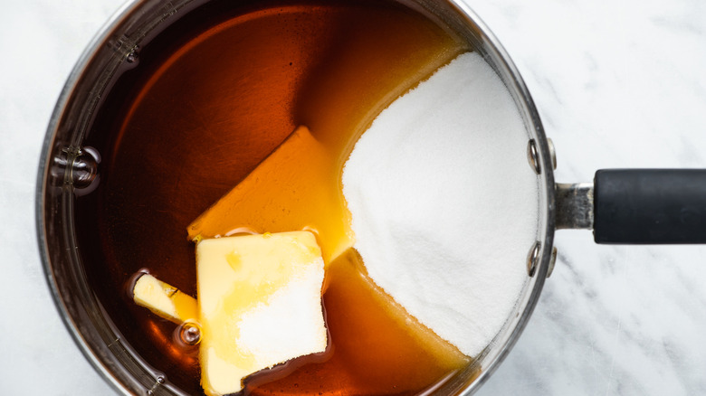 - Add the butter, sugar, and maple syrup to a saucepan and heat on a low-medium temperature, stirring occasionally until the butter melts.