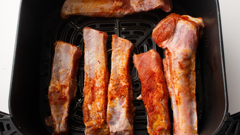 How easy was that prep? Now, you can go ahead and dump the seasoned ribs into the tray of your air fryer and slide it back in. Set your timer for 10 minutes, and let the machine do its thing. About halfway through (at the 5-minute mark), you'll want to shake the air fryer tray to turn the ribs over to the other side. That way, both sides cook evenly.
