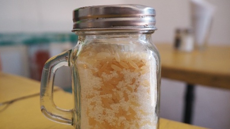 Anyone who has ever been salting their fries or a couple of fried eggs or anything else from a restaurant only to look down and notice grains of rice inside the salt shaker might have wondered why those stray grains were there. But if you've ever shaken a canister of seasoning that's hardened into a brick or dropped your phone in a bag of rice after getting it wet, you might already have an inkling as to why. And according to Taste of Home, restaurants use rice in a very similar manner, all for the convenience of their customers.