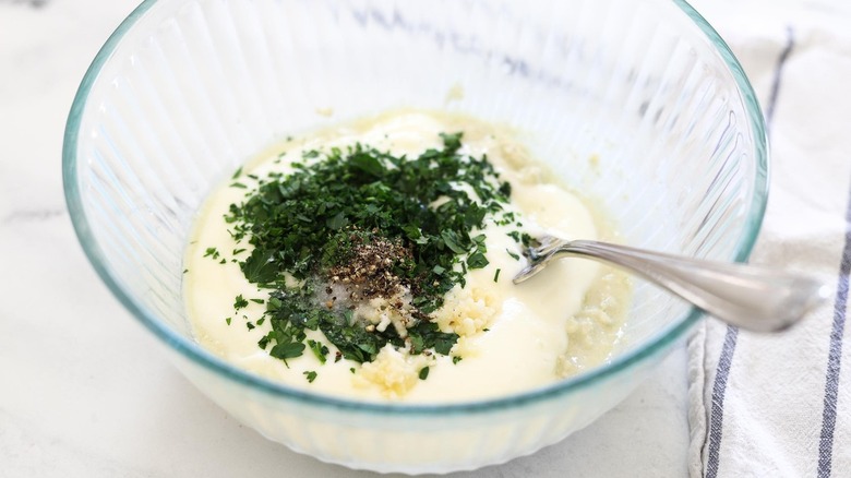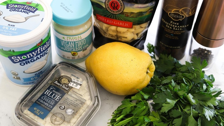 The main ingredient in this blue cheese dressing is the blue cheese. Hondrum uses the pre-crumbled kind, but you can easily crumble your own, if you'd prefer. You'll also need a little mayonnaise — Hondrum says she's partial to the kind made from avocado oil, as she feels this "[avoids the] unhealthy fats in traditional mayonnaise." The bulk of the dressing is made with plain yogurt, and you can use any kind you'd like, as long as it's unflavored — non-fat, full-fat, Greek — it 's completely up to you.